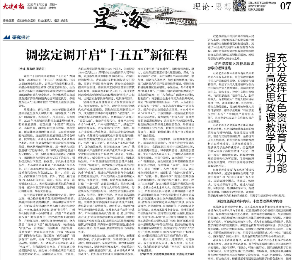 3月30日,《大连日报》理论版刊发大连市政府研究室与公司永利yl23411研究生共同署名文章《调弦定调开启“十五五”新征程》,署名作者师家琪、崔诗萌为公司永利yl234112024级研究生。